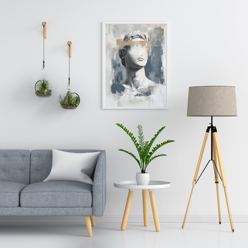 A stylized bust of a Greek statue, partially abstracted with painterly strokes and soft distressing. It merges classical sculpture with modern minimalism, a refined piece that nods to the past without overpowering the room.