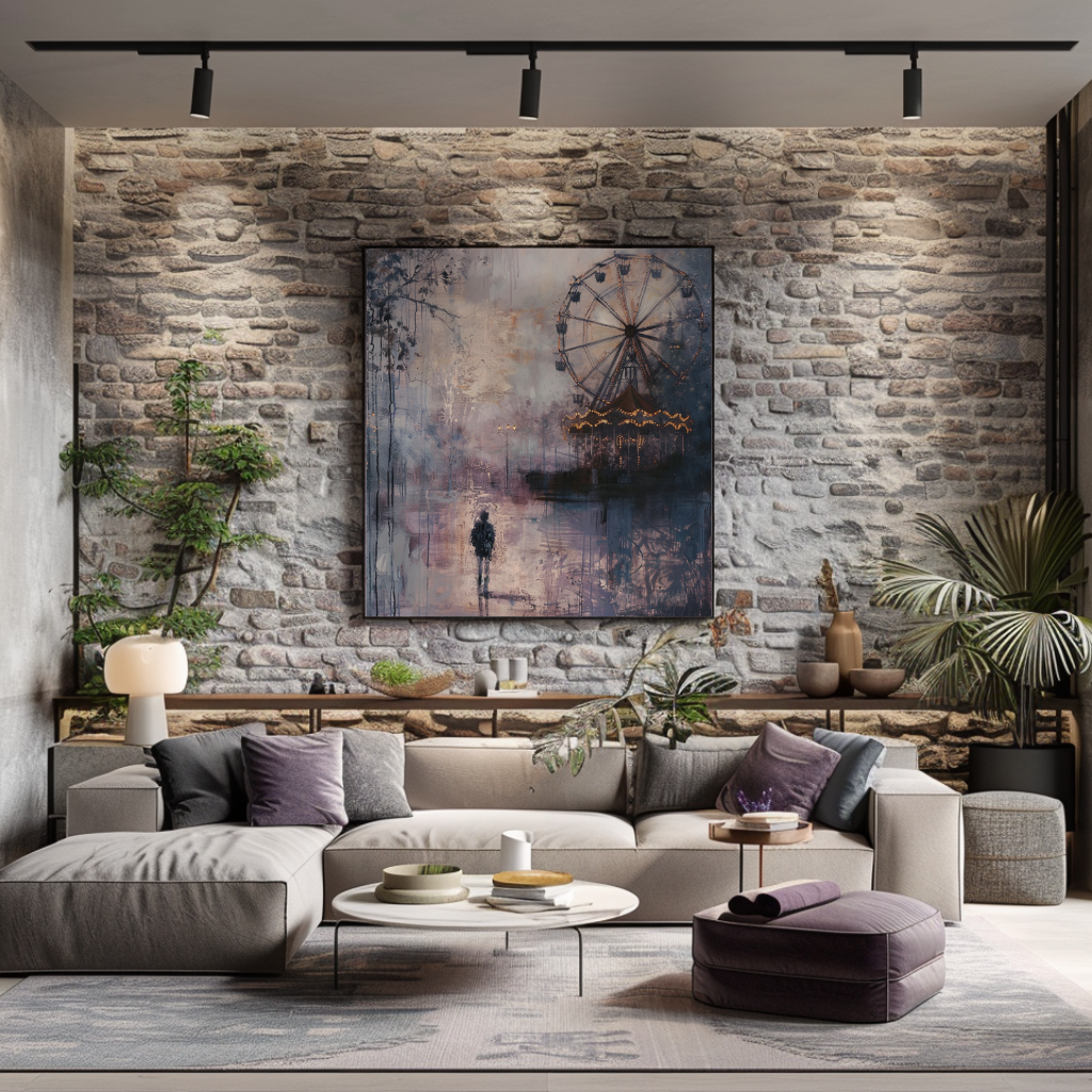 The hazy magic of an abandoned carnival, where memory and dream blur into one. This emotionally charged painting features a glowing Ferris wheel and carousel, softly emerging from a misty, abstracted background. Rich in expressive textures and romantic melancholy, this piece evokes nostalgia and introspection in a beautifully haunting atmosphere.