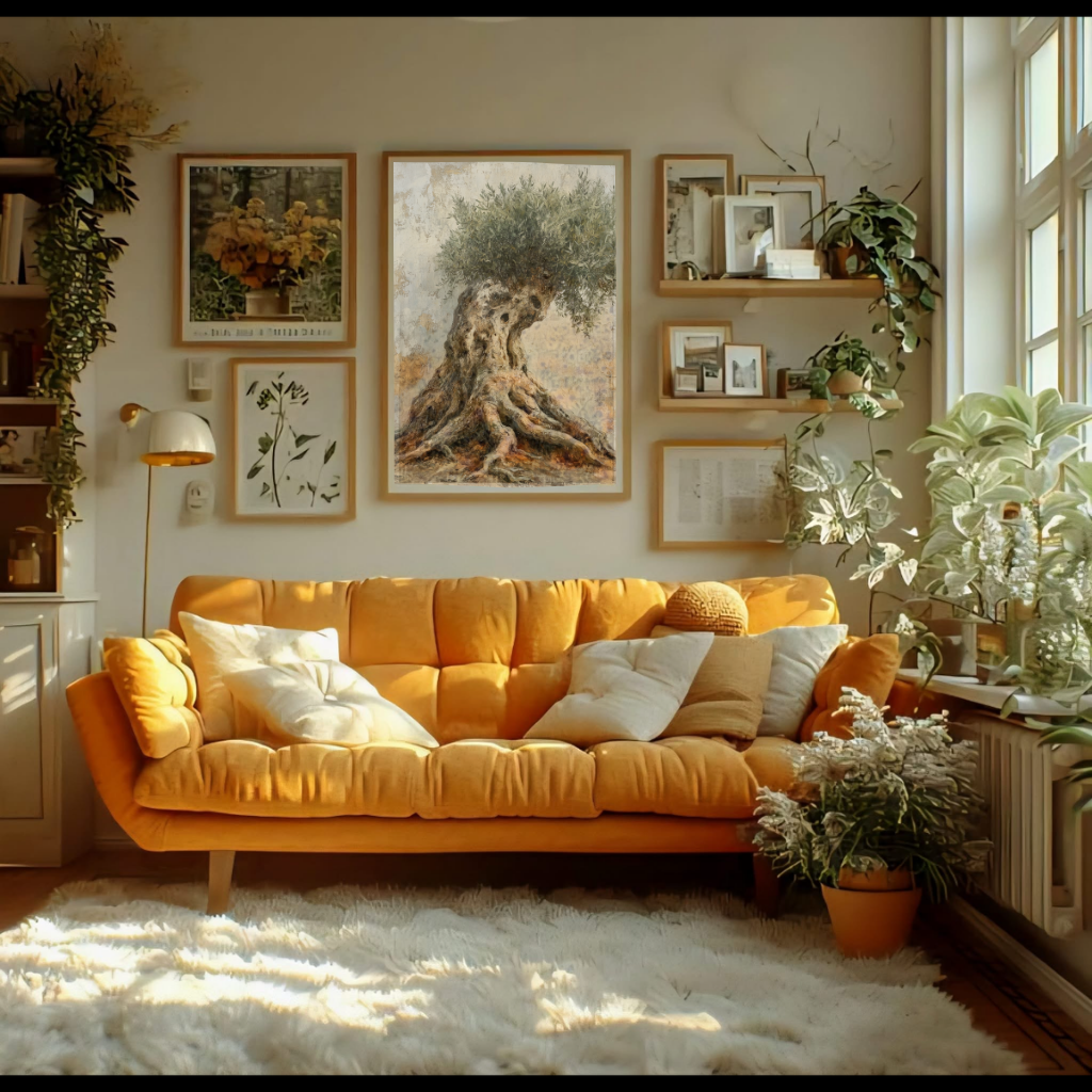 A thick, ancient olive trunk stands resilient, cut low yet full of life, with small, fresh leaves sprouting from its crown. This abstract piece symbolizes nature’s quiet determination to begin again. It evokes themes of regrowth and stillness, making it a calming focal point in earthy or natural-toned interiors.