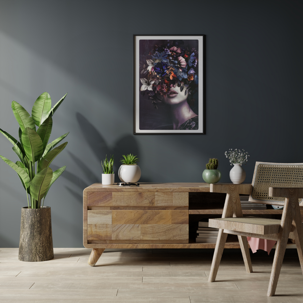 Mysterious and poetic, Wildflower Veil presents a woman partially obscured by a mask of wild blossoms. Set in muted violet and indigo against a deep forest backdrop, this vintage-inspired oil portrait is infused with quiet strength and dreamlike melancholy. Textured brushstrokes and rich details make it a captivating centerpiece for soulful, bohemian, or eclectic spaces.